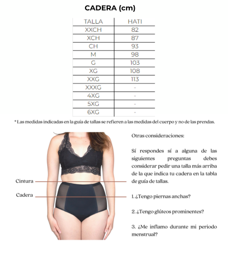 Si respondes sí a alguna debes considerar pedir una talla más arriba de la que indica tu cadera en la tabla de guía de tallas.