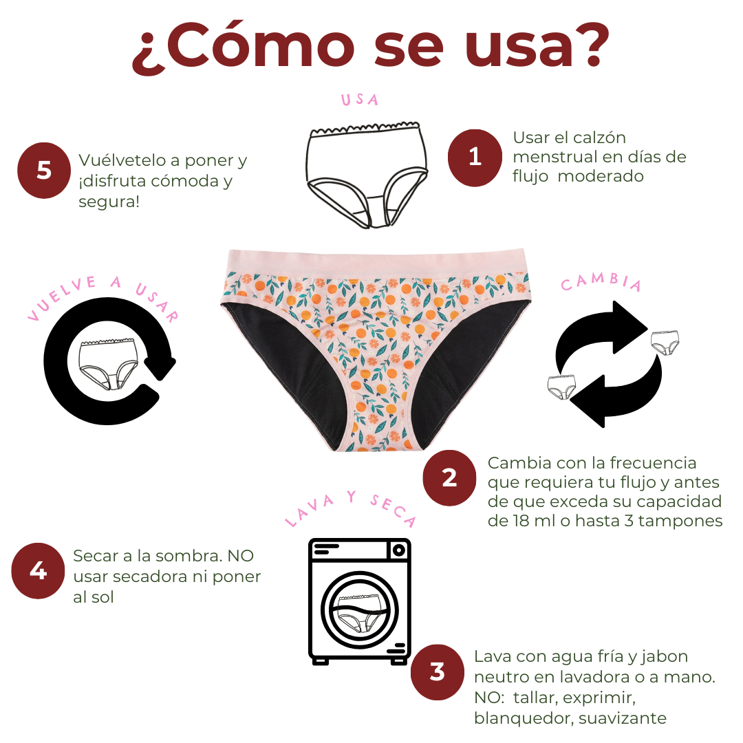 Cambia con la frecuencia que requiera tu flujo al momento de uso y antes que exceda su capacidad máxima de absorción. Sigue las instrucciones de uso, cambio, lavado, secado y vuelve a usar por años. Más detalle aquí