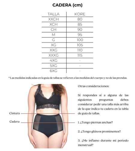 Por lo cual si tienes piernas anchas te sugerimos pedir la siguiente talla. Si te inflamas en tu periodo es probable que tu talla sea diferente en esos días, considera pedir una talla más para mayor comodidad.
