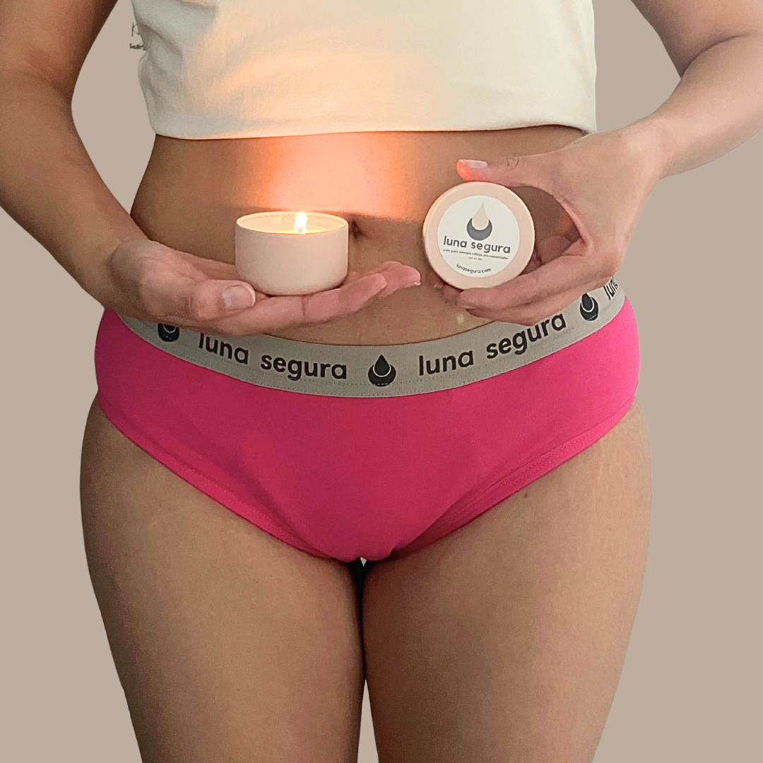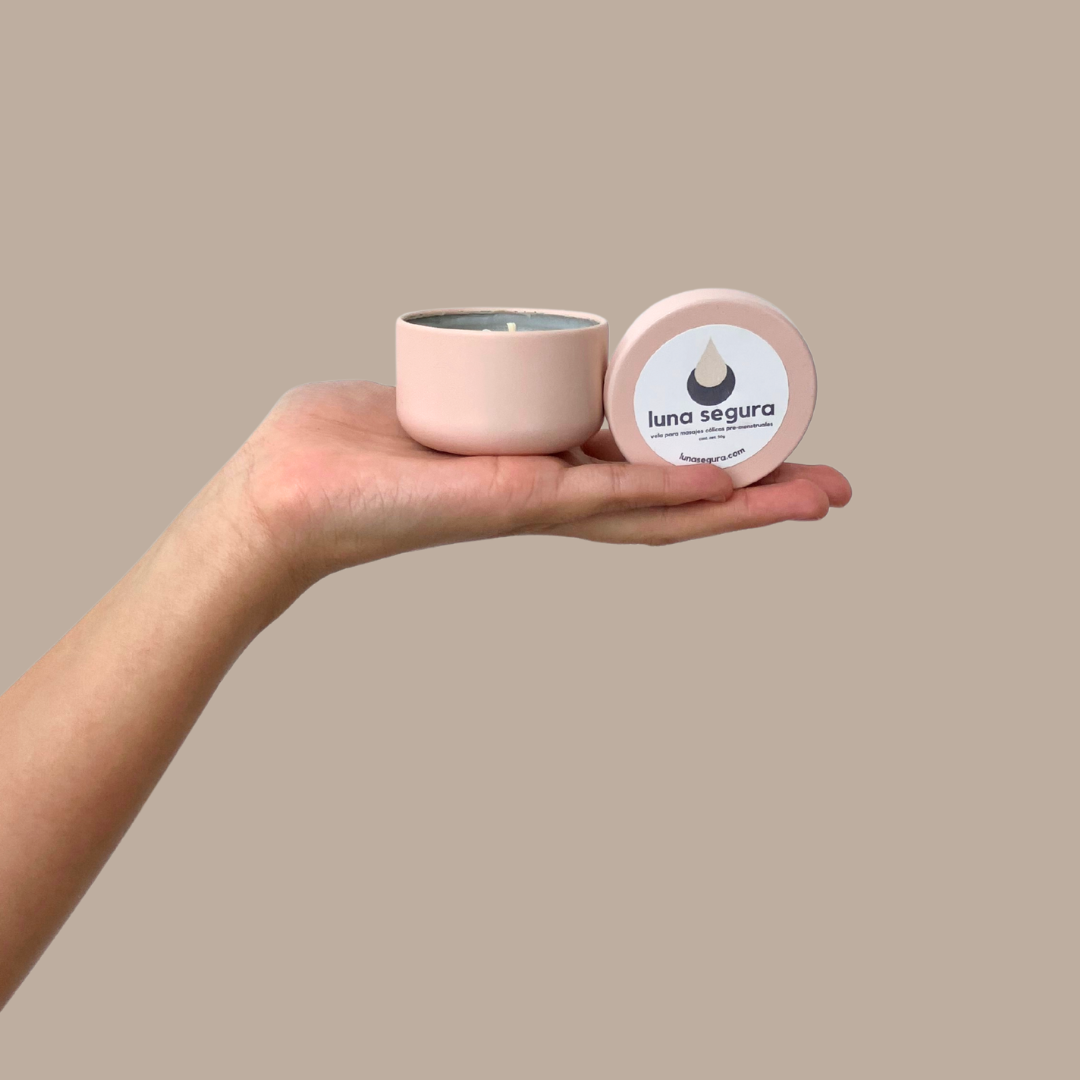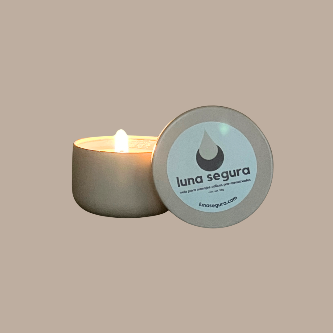 Vela para Cólicos Luna Segura, disminuye con ligeros masajes, aroma y nuestra playlist para los cólicos menstruales. Relájate, respira y deja que tu cuerpo descanse.
